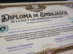 Todo en el marco de la presentación del Libro, *LA CIENCIA DE LA PAZ* del presidente del Movimiento Internacional, Acción de Paz y nominado al premio Nobel de La Paz 2026, Dr. H.C. Alejandro D’Alessandro. 8 de Mayo Auditorio de la Honorable Cámara de Diputados de la Nación Argentina .