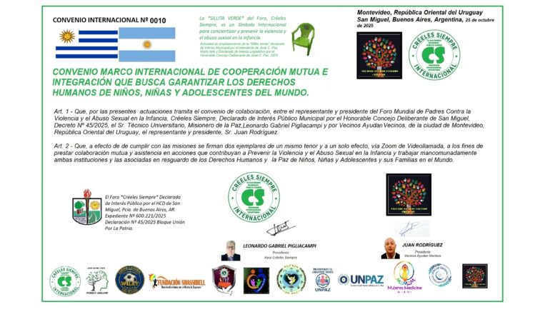 Con el convenio Internacional N.º 0010 del Foro Créeles Siempre, queda incorporado el movimiento “Vecinos Ayudan Vecinos” al Foro Mundial de Padres Contra la Violencia y el Abuso Sexual en la Infancia, Créeles Siempre y pasa a formar parte del comité internacional junto al resto de las organizaciones ya adheridas en diferentes países del mundo.